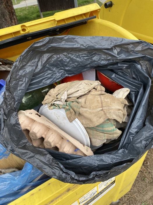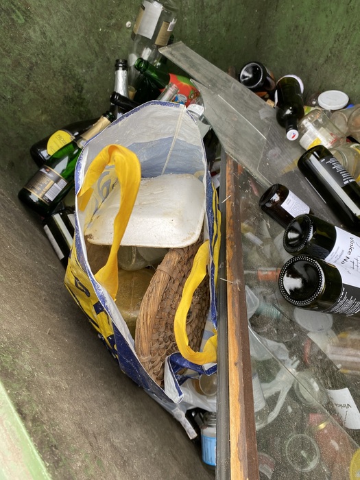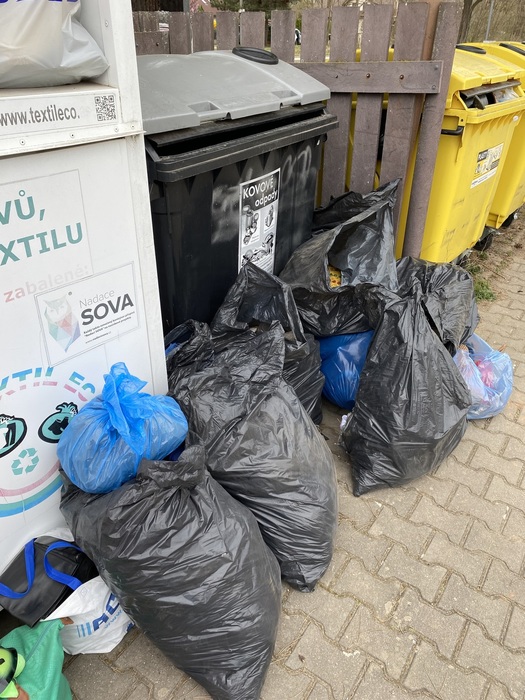 Dnešní pohled ke kontejnerům: pytle s odpadem vyskládané vedle nich, další pytle se směsí všeho v kontejnerech na plast a ani kontejner na sklo nezůstal ušetřen. Uklízíme, zametáme, ale nejsme kouzelníci (ani zaměstnanec obce není kouzelník, natož náš sluha).