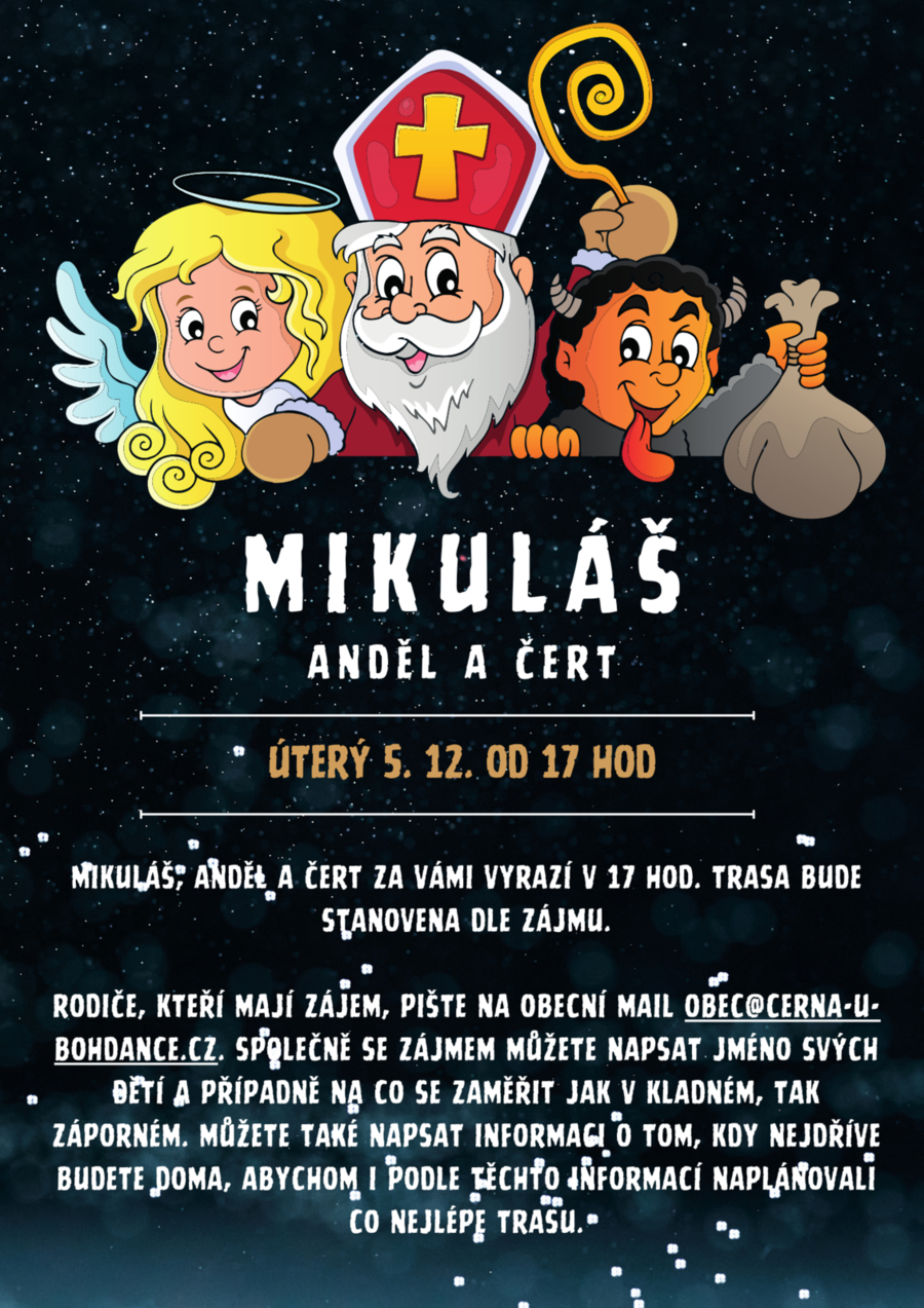 Úvod > Občan > Oznámení a hlášení > Mikuláš, čert a anděl navštíví Černou u Bohdanče